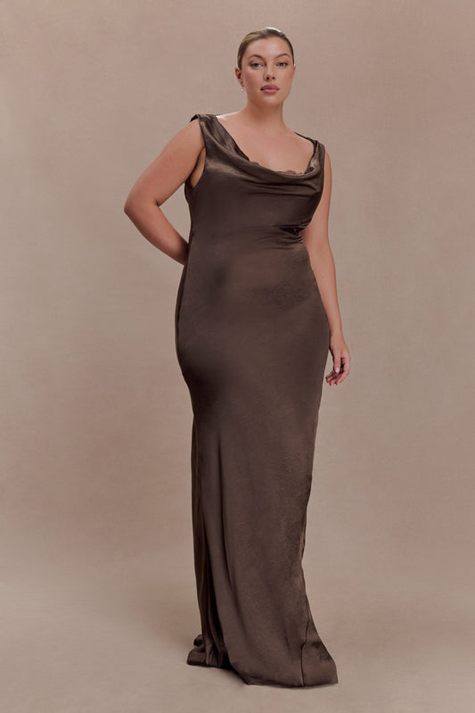 Dalia Off Shoulder Satin Maxi Dress - Dark Chocolate