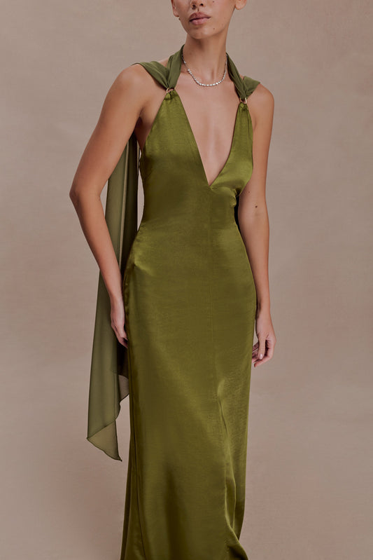 Myla Draped Shoulders Satin Maxi Dress - Khaki