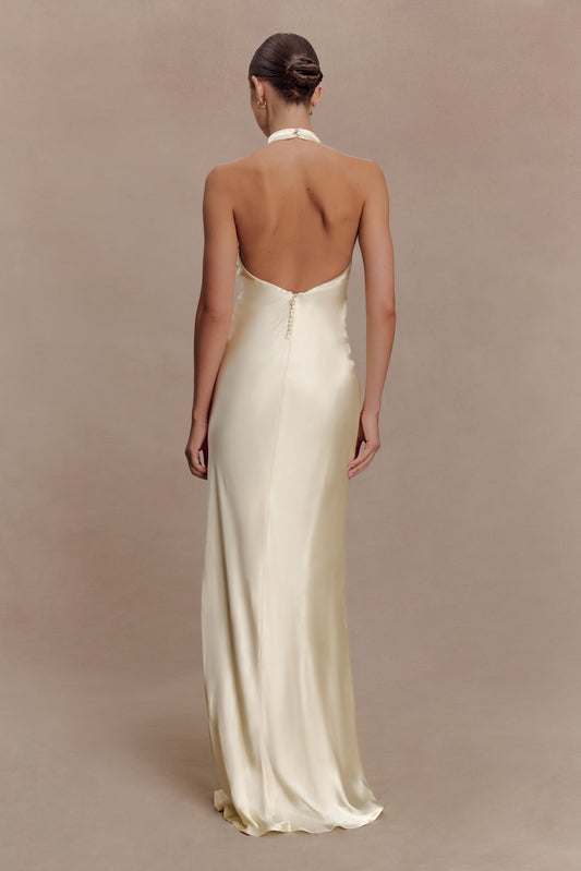 Regular price £109Unit price / perBack In StockEsther Iridescent Satin Cowl Maxi Dress - Lemon Sorbet