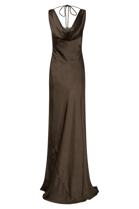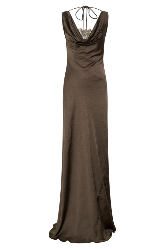 Ashley Cowl Neck Lace And Satin Maxi Dress - Mocha