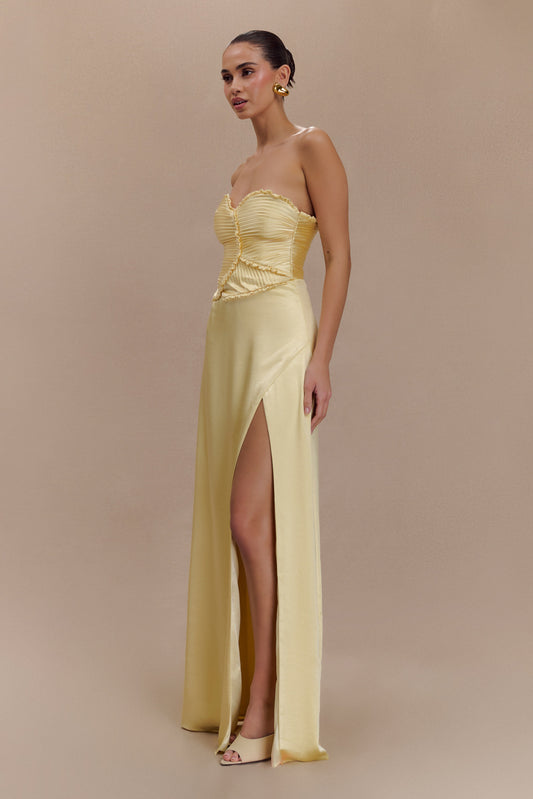 Larissa Satin Maxi Dress With Ruched Petals - Lemon