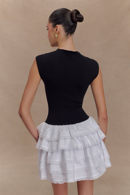 Maeve Contrast Ruffle Knit Mini Dress - Black/White