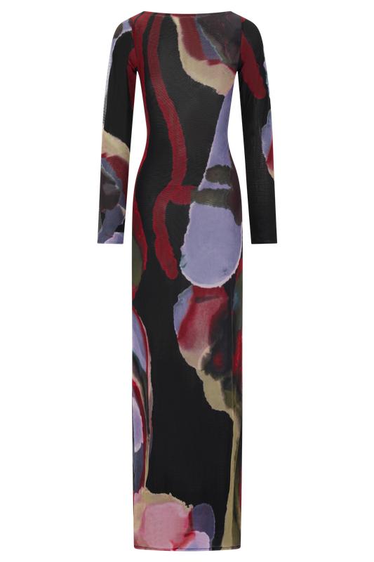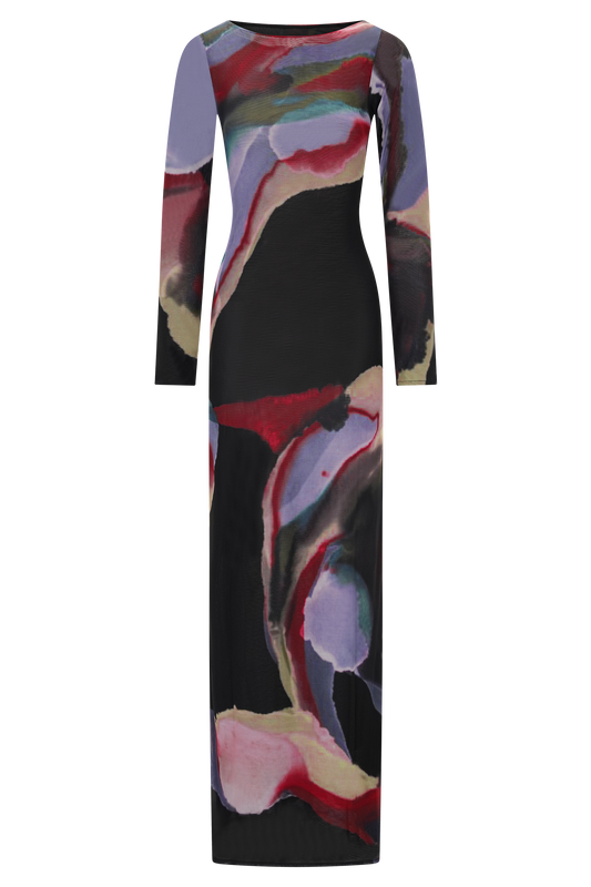 Long Sleeve Mesh Maxi Dress - Multi Fluid Reverie Print
