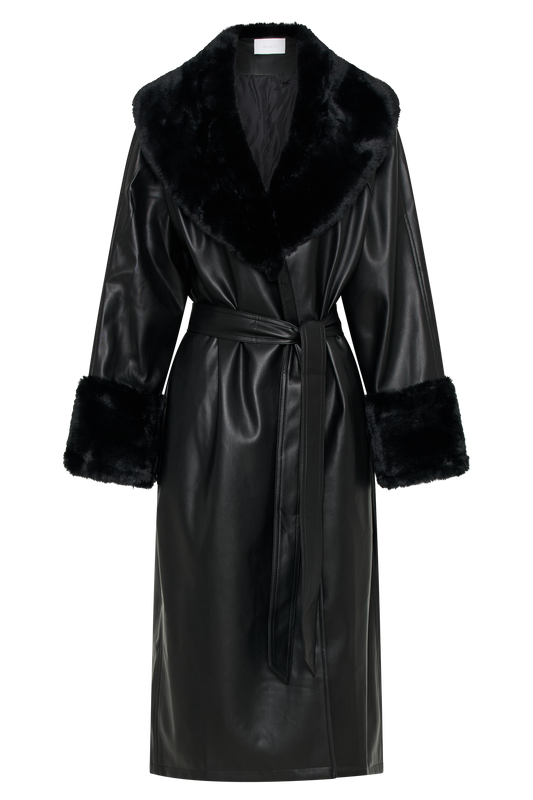 Rebekah Oversized Pu Trench Coat With Fur Trim - Black