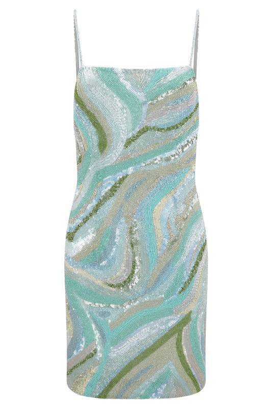 Eloise Hand Beaded Mini Dress - Blue Swirl Print