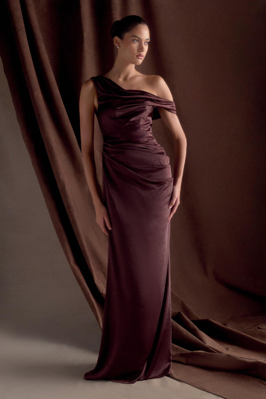 Dalia Off Shoulder Satin Maxi Dress - Dark Chocolate