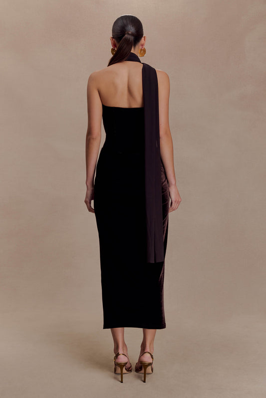 Mattea Velvet Midi Dress With Scarf - Chocolate