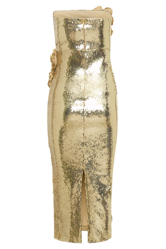 Strapless Sequin Rose Midi Dress - Gold