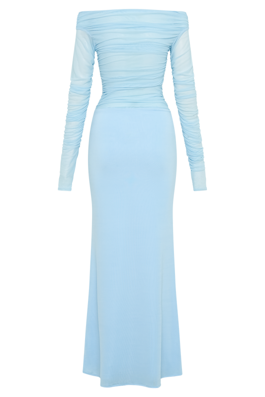 Mesh And Slinky Off Shoulder Maxi Dress - Sky Blue