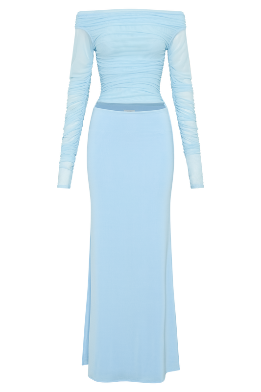 Mesh And Slinky Off Shoulder Maxi Dress - Sky Blue