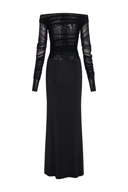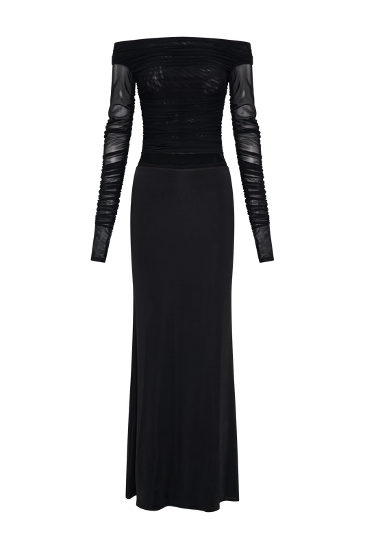 Mesh And Slinky Off Shoulder Maxi Dress - Black