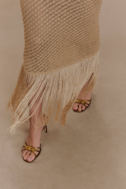 Raelynn Metallic Knit Fringe Midi Dress - Gold