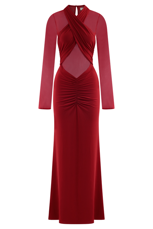 Slinky And Mesh Long Sleeve Maxi Dress - Ruby