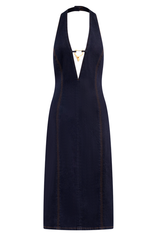 Shauna Denim Halter Midi Dress - Indigo Blue