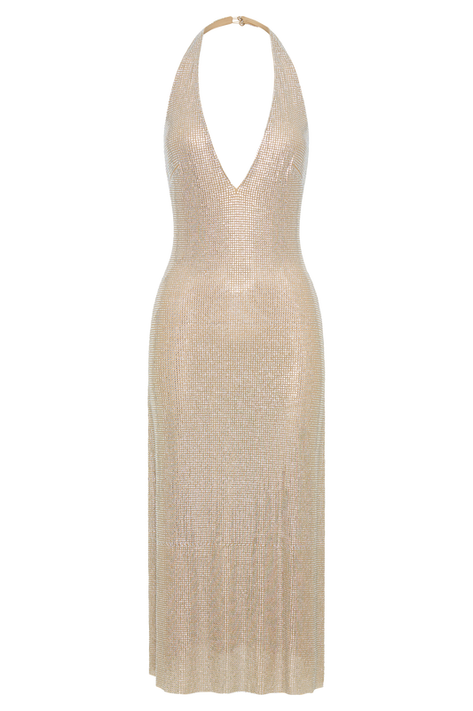 Diamante Halter Midi Dress - Nude
