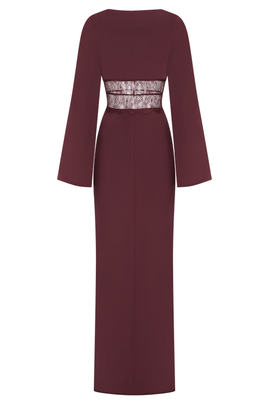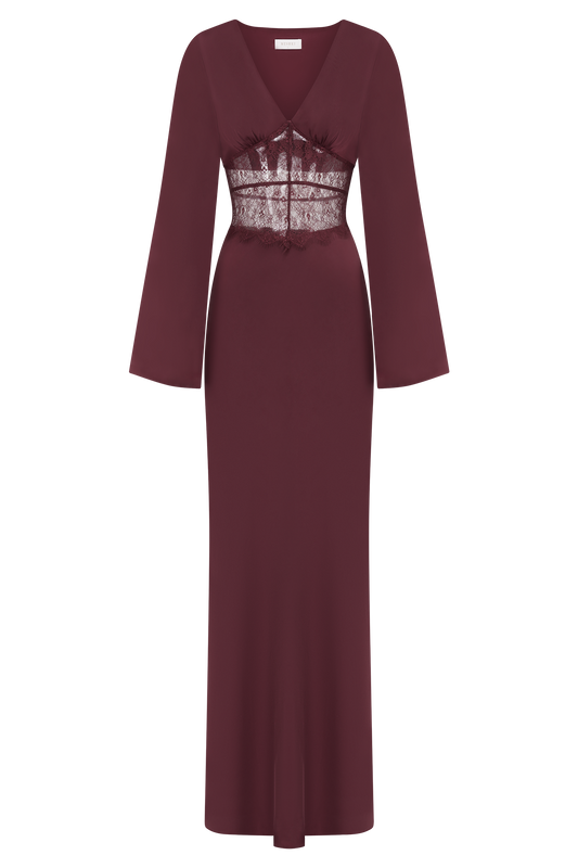 Kaya Long Sleeve Satin And Mesh Maxi Dress - Wine
