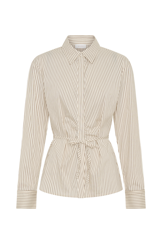 Tie Back Cotton Shirt - Beige Pinstripe