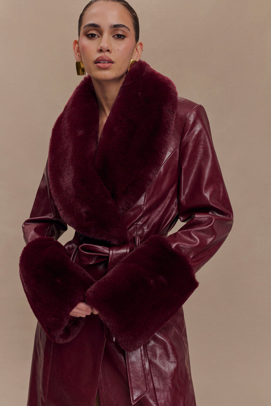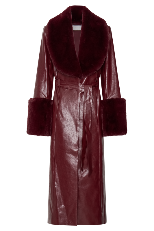 Bec Faux Leather Trench Coat With Faux Fur - Cherry Red