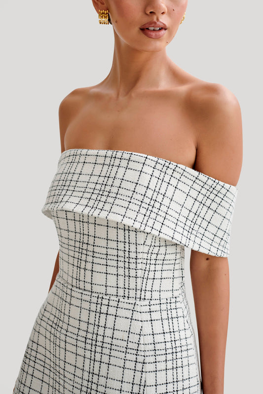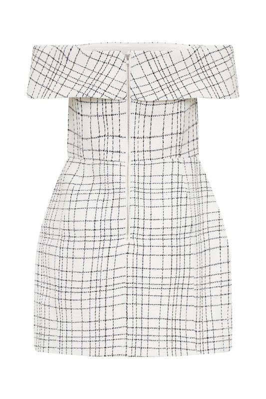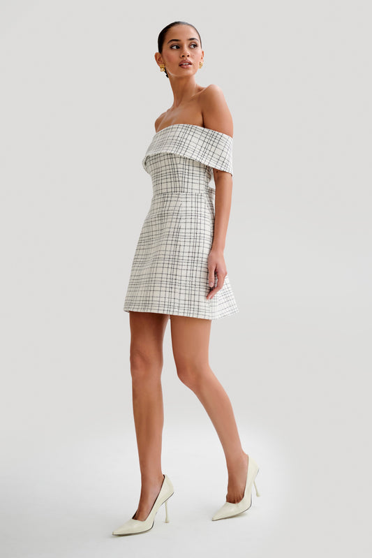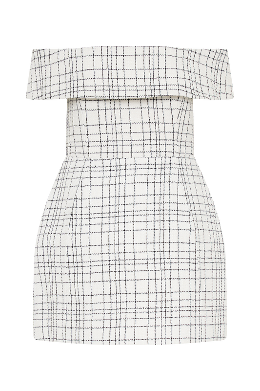 Helena Tweed Off Shoulder Mini Dress - White Check