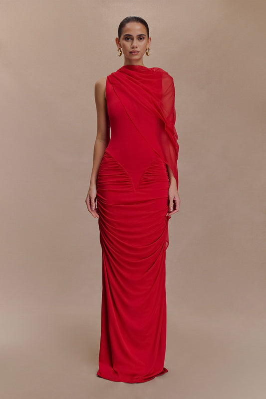 Amandine Ruched Slinky Maxi Dress - Ruby