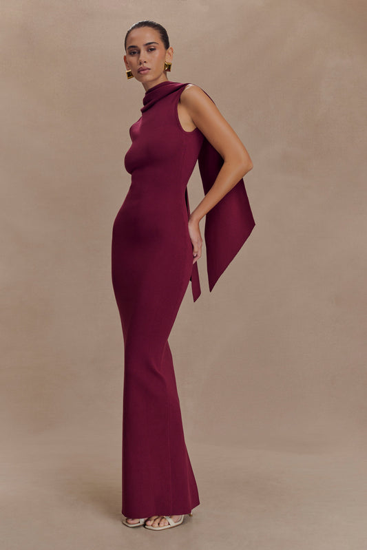 Kaitlin One Shoulder Slinky And Mesh Maxi Dress - Burgundy