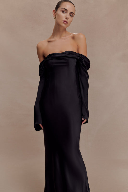 Dalia Off Shoulder Satin Maxi Dress - Dark Chocolate