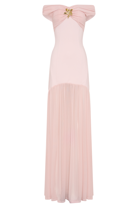 Slinky And Mesh Off Shoulder Maxi Dress - Pale Pink