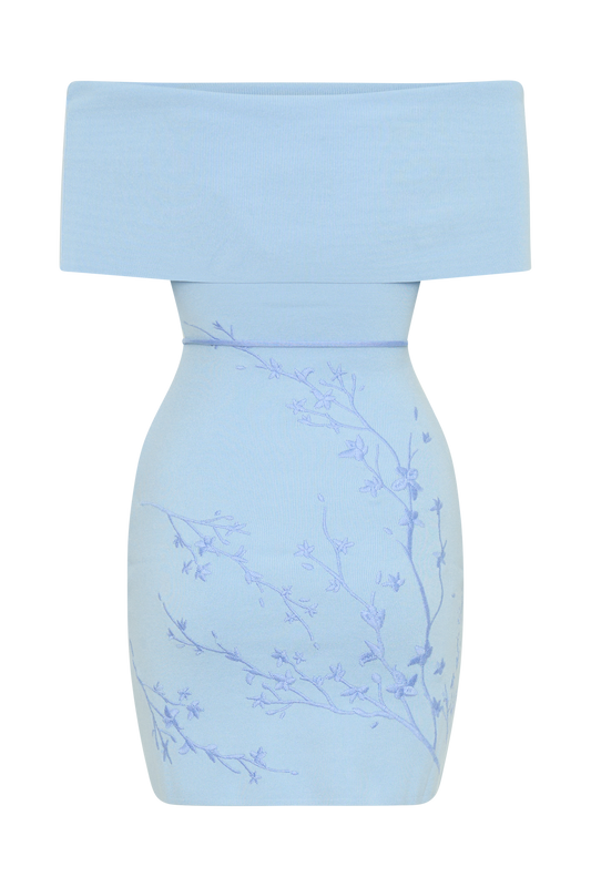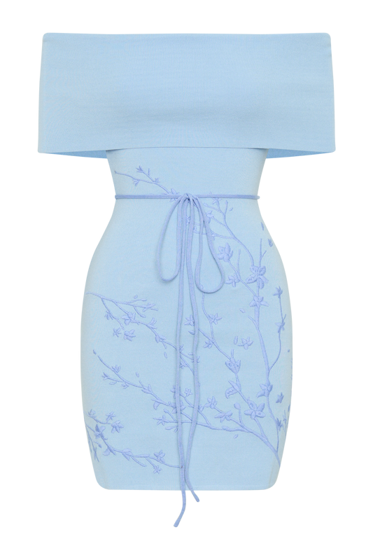Mallory Off Shoulder Embroidered Knit Mini Dress - Ice Blue