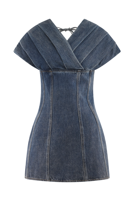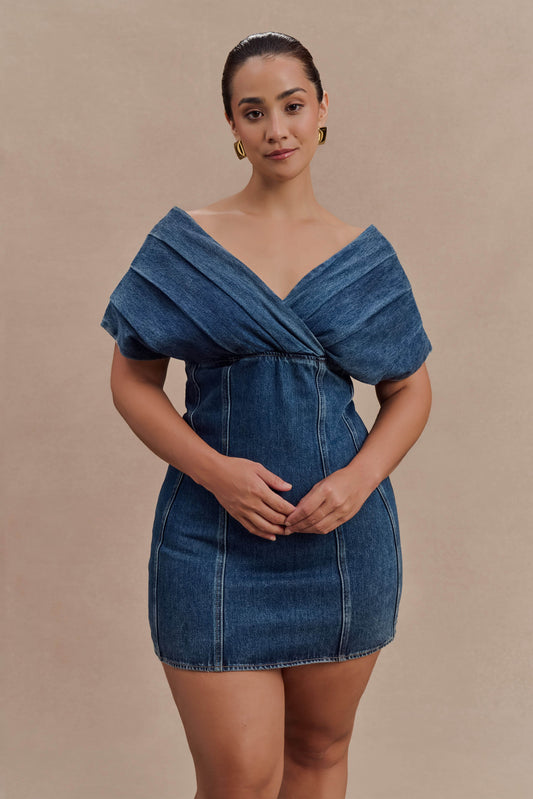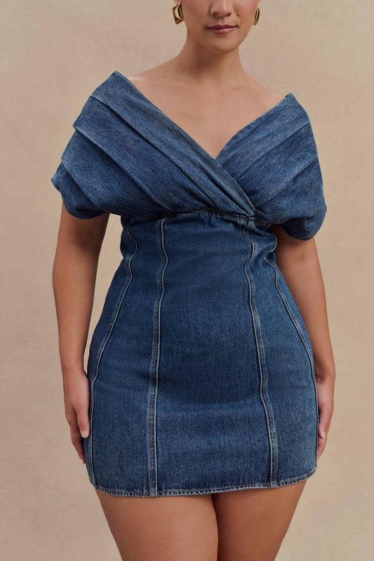 Pascale Off Shoulder Denim Mini Dress - Washed Dark Blue
