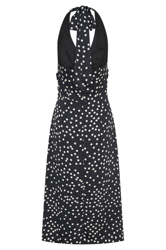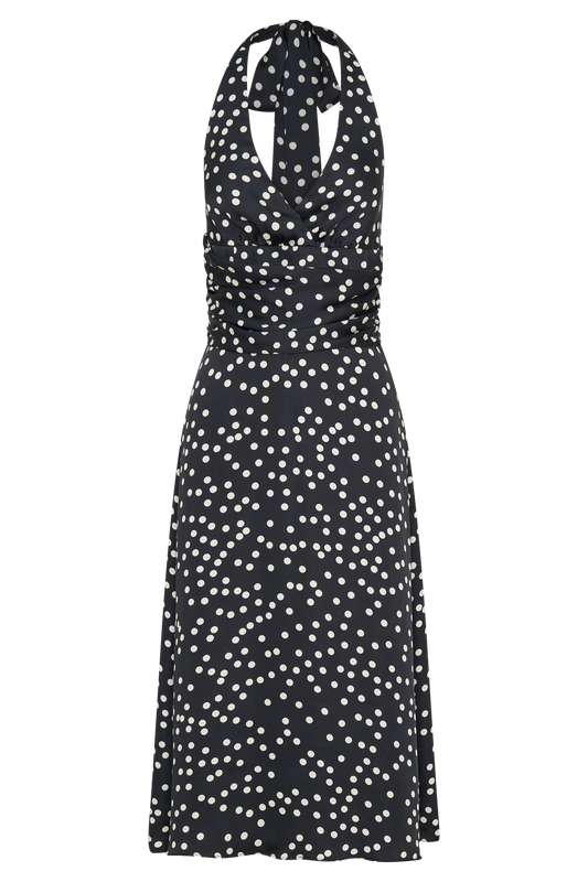 Marguerite Satin Halter Midi Dress - Black Polka Dot Print