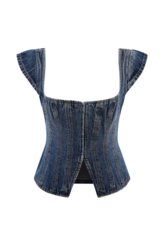 Loretta Cap Sleeve Denim Top - Washed Dark Blue