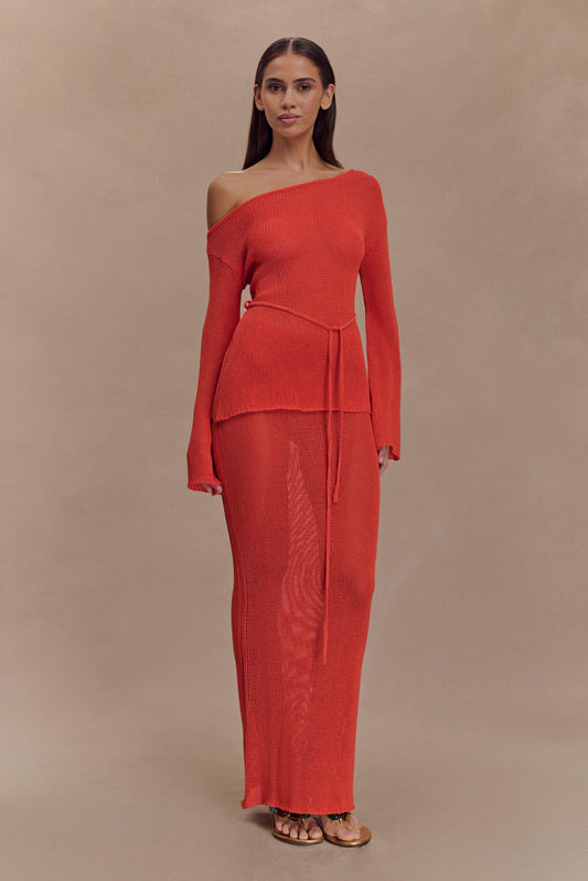 Solstice Off Shoulder Crochet Knit Maxi Dress - Blood Orange
