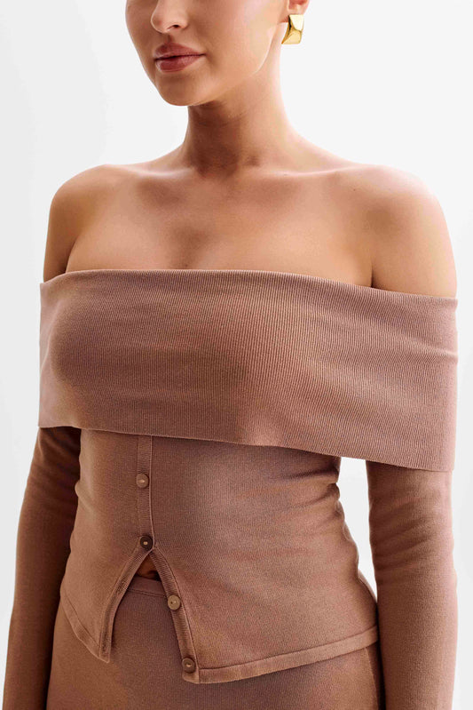 Buttoned Off Shoulder Knit Top - Pecan