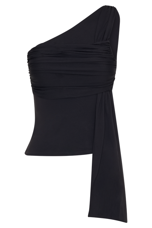One Shoulder Recycled Nylon Top With Drape - Black