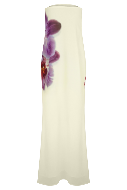 Amaya Strapless Chiffon Maxi Dress - Ivory Koi Orchid Print