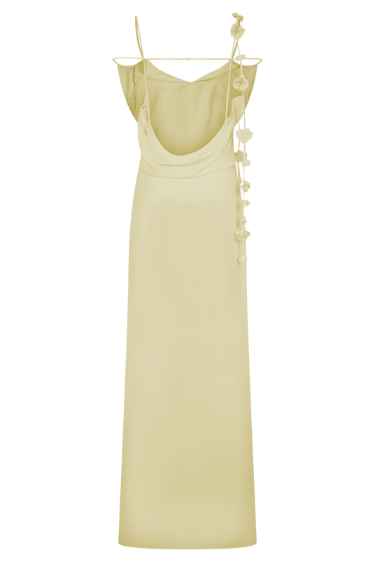 Larissa Satin Maxi Dress With Ruched Petals - Lemon