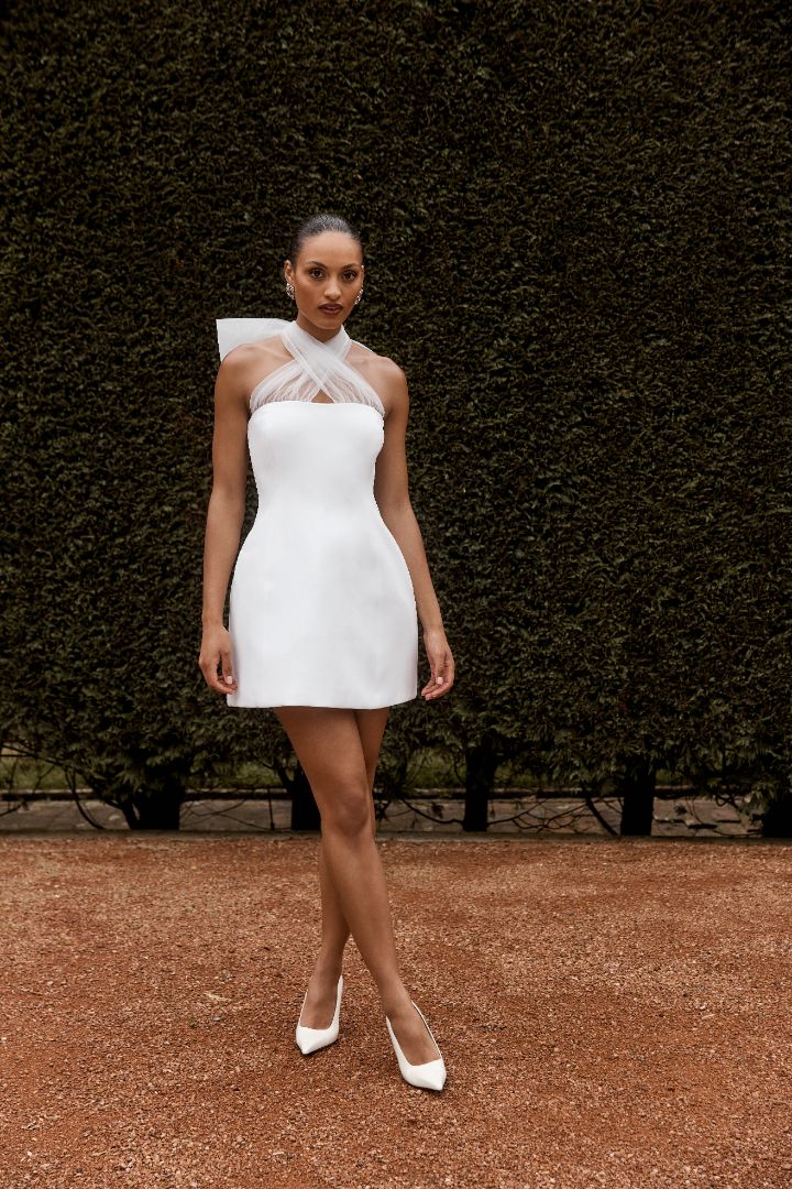 Halter Neck: Exuding sophistication and timeless glamour, halter neck mini dresses flatter the neckline and accentuate the bride's figure with understated elegance.