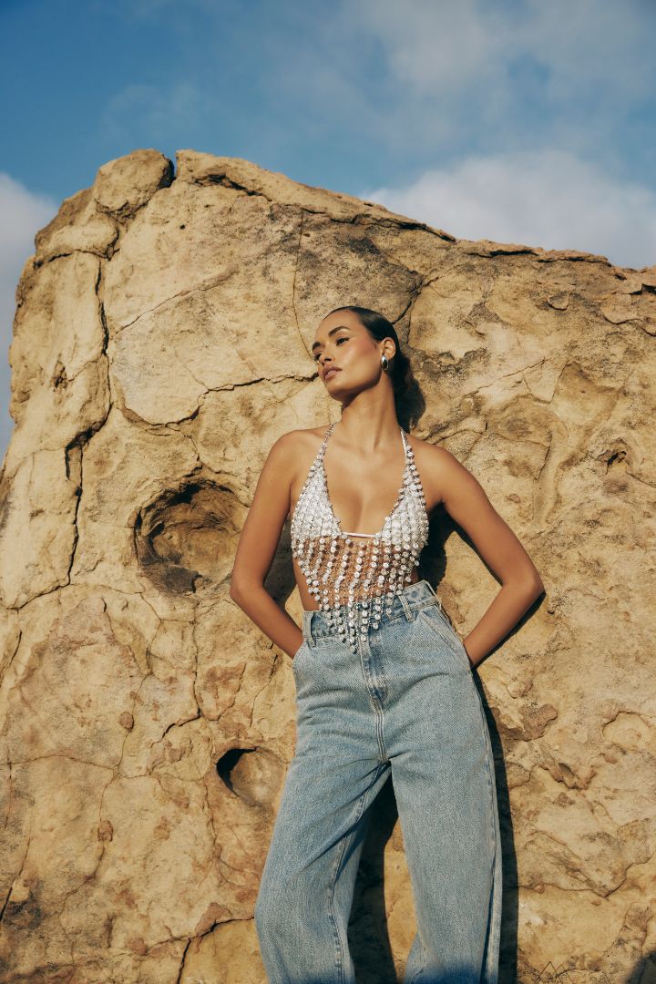 Check out the SADIE Pearl Knit Bikini Top with the matching SADIE Pearl Knit Bikini Bottom. If you want to show less skin and showcase more glamour, try the GRETCHEN Pearl Halter Top with your favourite jeans.
