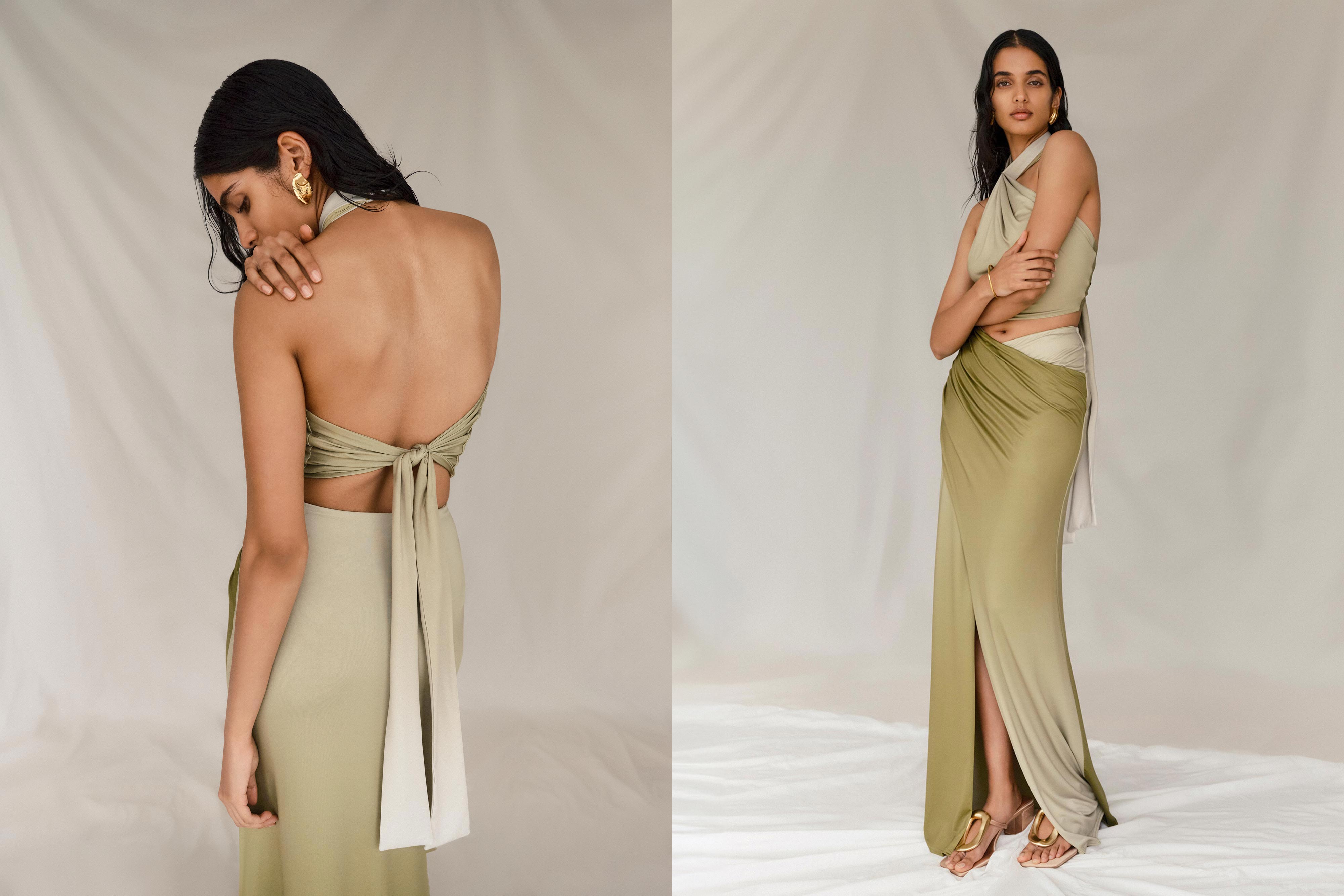 Taking reference from the divine radiance of a halo, this edit incorporates pastel and cascading ombre hues, alongside pleated satin, and our new wide ripple hemlines that flute outwards like the rays of the sun.