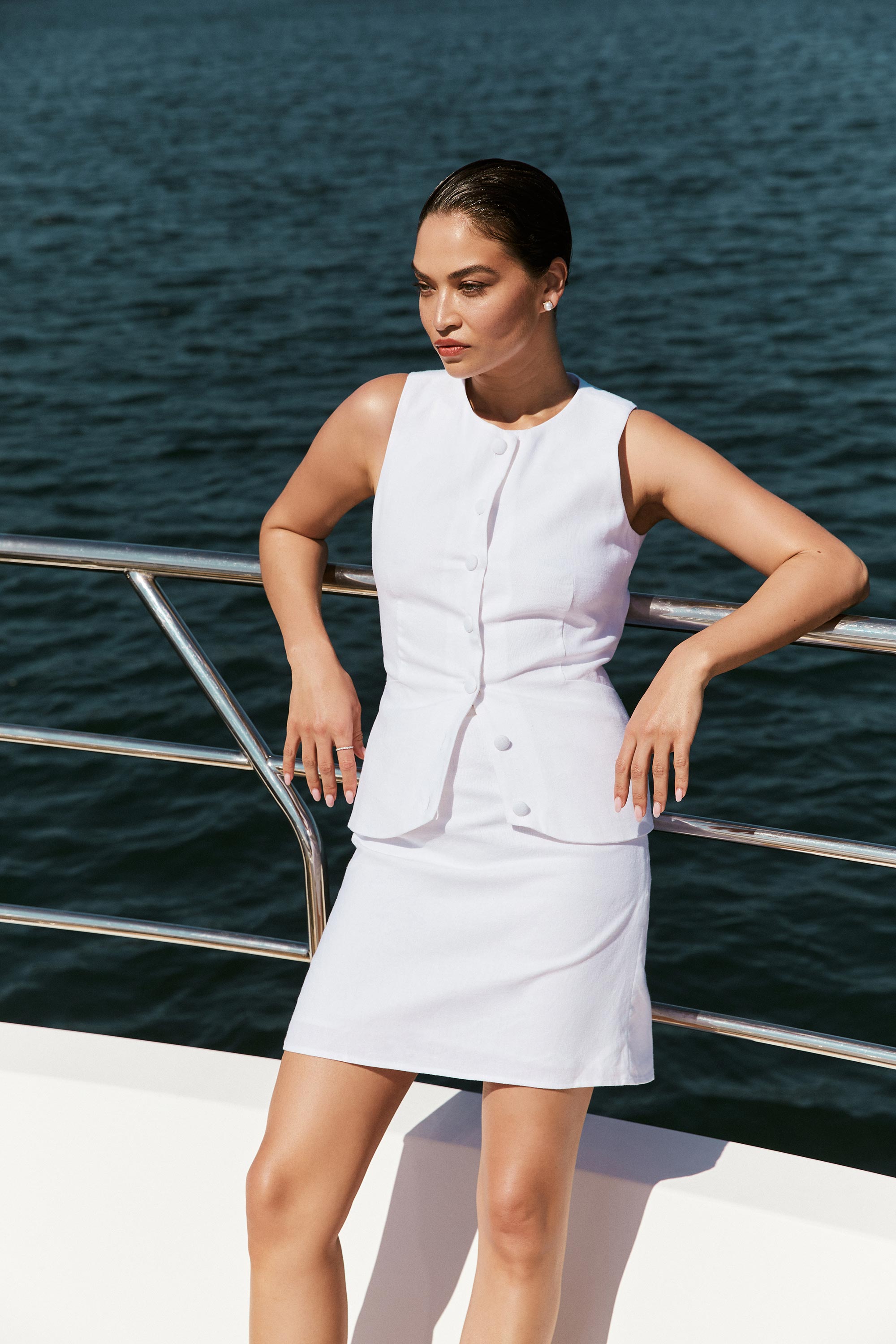 Captivate in a new take on understated luxury in scalloped hemlines, precise pleating and tailored suiting, set against soft linen fabrications.