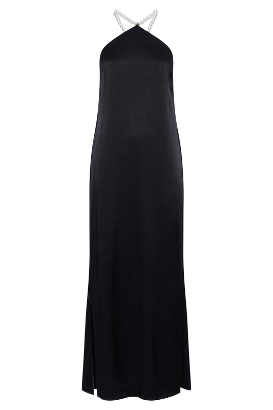 Blanche Satin Pearl Halter Maxi Dress - Black
