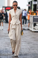 Refine the untamed in structured corsetry meeting flowing knitwear. Tailored wide-leg pants balance against draped maxis. Deep, earthy tones—camel, ecru, merlot—bring warmth, while crisp white and inky black cut through.