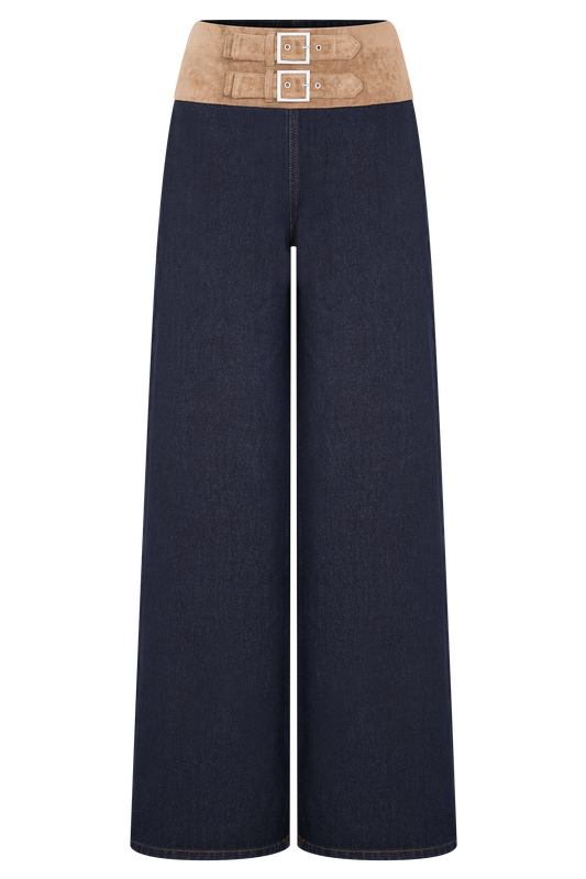 Faux Suede Belted Denim Wide Leg Jeans - Indigo Blue