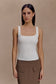 The AISLING Ribbed Square Neck Sleeveless Top is a timeless essential with a refined edge. Designed with a clean square neckline and a low back, it frames the silhouette with modern simplicity. The fitted bodice in ribbed fabrication flatters the figure, while the unlined finish keeps it lightweight and versatile. Effortlessly styled up or down, this top is a foundation piece for endless looks.