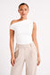 ALAYNA is an asymmetrical top with a straight-cut neckline and strategic ruching. Sewn from a custom blend of elastane and recycled nylon, its stretchy fabrication offers a fairly bodycon fit that highlights your curves. The ruching around the waist and arms further shapes and elongates the body, creating a universally flattering silhouette. Fresh and unique, this seasonal must-have can be worn as a solo feature or layered with a textured blazer.