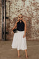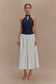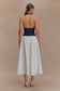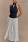 The ASHWIN Denim Cotton Midi Dress is a modern blend of bold structure and soft movement. Featuring a halter neckline with a secure back button closure, this standout silhouette pairs a fitted denim bodice with a crisp contrast cotton skirt. A front cutout detail and drop waist add a touch of edge, while the midi length offers balance and elegance. Finished with a side zip and full lining for a smooth fit, this dress is perfect for day-to-night styling, city exploring, or elevated summer occasions.