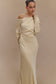 The AVERY Long Sleeve Maxi Dress features an asymmetrical drop shoulder neckline, adding modern sophistication. With long sleeves for coverage and grace, it boasts side gathered waist detailing for a touch of femininity. Lined for comfort, this dress ensures you look and feel your best for any elegant occasion.