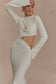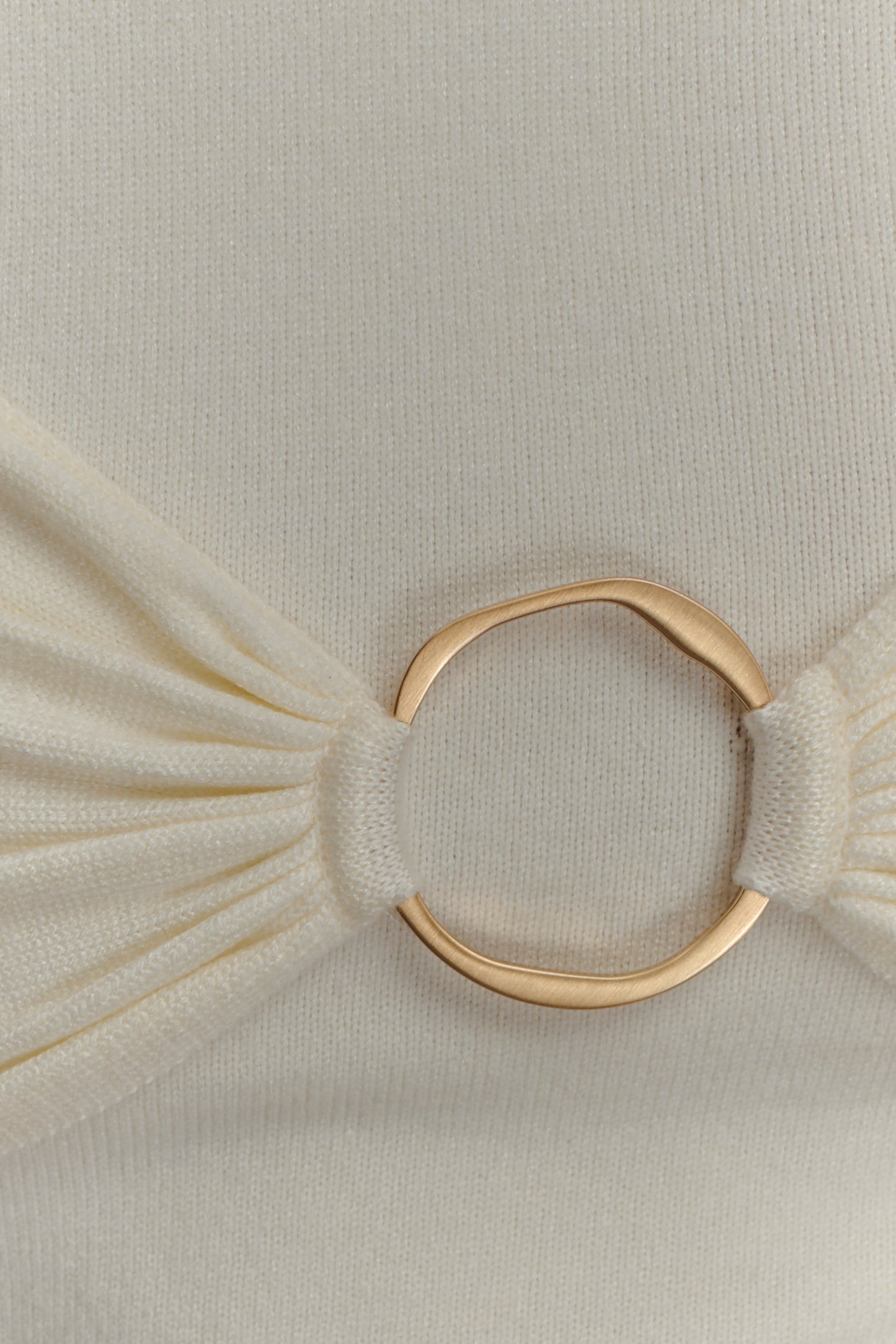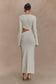 The AZARIAH Long Sleeve Knit Midi Dress blends modern edge with refined minimalism. Designed with a high neckline and body-hugging silhouette, this midi-length dress features a gathered bust overlay and a striking hardware accent that draws attention to the asymmetrical waist cutout. Long sleeves balance the bold design, while the unlined knit offers a lightweight, second-skin feel. This dress is the perfect statement piece for cooler nights, elevated occasions, or when you want to turn heads with ease.
