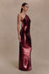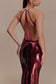 The BALDWIN Sequin Cut Out Maxi Dress commands attention with its sleek, high-shine silhouette. Featuring a halter neckline and a fitted bodycon design, it contours the figure while catching the light from every angle. A sheer mesh panel at the back adds a touch of contrast, balanced by the fluid movement of a back leg split. Crafted with an elasticated neckband for comfort and partially lined for a seamless fit, this dress is the definition of modern allure — made for the spotlight.