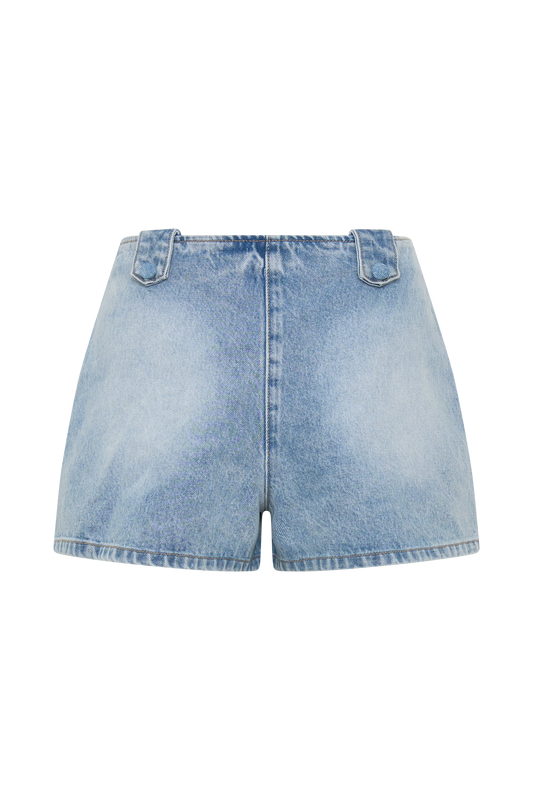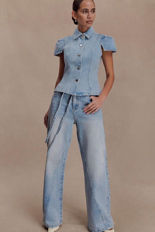The BENTLY Short Sleeve Denim Top brings tailored structure to everyday dressing. Designed with a sharp collared neckline and classic button-front closure, it’s sculpted through the body with front and back princess seams for a defined, fitted silhouette. The longline cut elongates the frame, while cap sleeves add a modern, feminine finish. Polished yet directional, this piece reimagines denim through a refined, contouring lens.